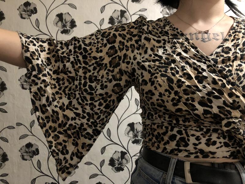 Блуза з леопардовим принтом, в гарному стані, дефектів не має. Іде на зав’язці, можна зав’язати з переду і з заду, рукава розлітайки