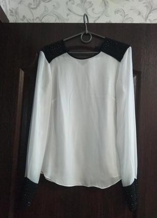 Белая Блузка с черными ставками на плечах и манжетах , на черных вставках нанесены черные стразы ,