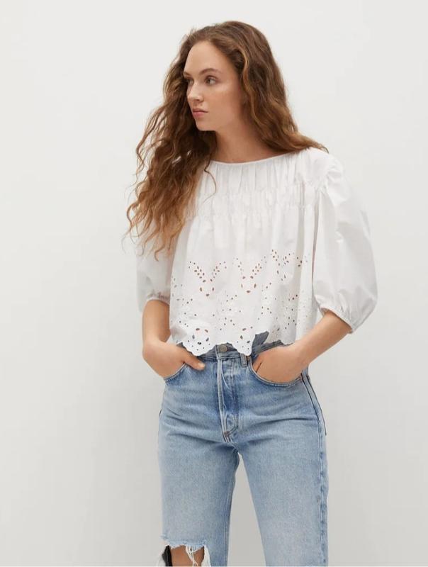 Короткий зріз. Широкий крій. Плісировка. Швейцарська вишивка. Відкритий виріз. Регульована застібка на спині. Рукава дуті з рубчиком. Ажурні деталі. СКЛАД: 100% БАВОВНА. ВИШИВКА: 100% БАВОВНА МАШИННЕ ПРАННЯ МАКС. 30 °C / 85ºF НЕ ВІДБІЛЮВАТИ ПРАСУВАННЯ МАКС. 150 °C / 300ºF НЕ ХІМ ЧИСТКА НЕ СУШИТИ В СУШИЛІ Ефектна літня блуза. Розмір підійде на с і м, л Заміри при необхідності надам