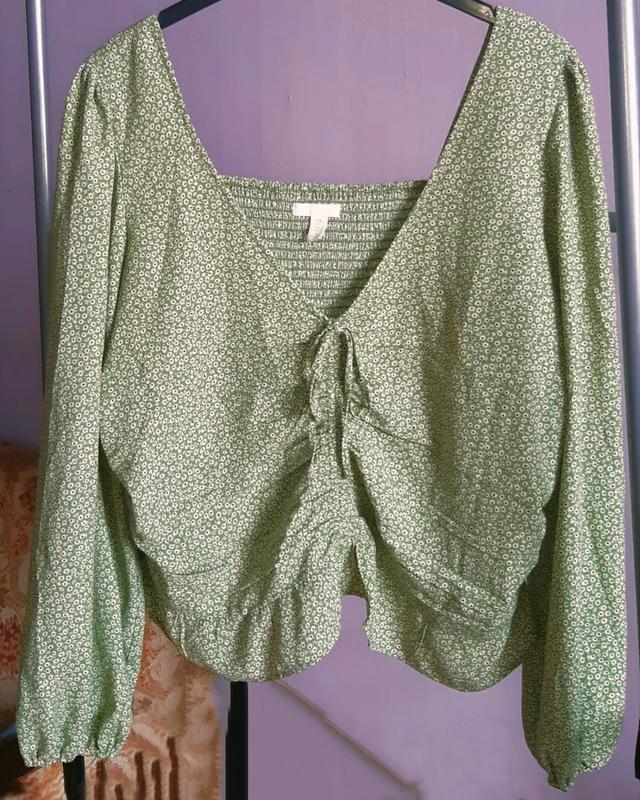 Актуальна вкорочена блуза-топ з об'ємними рукавами H&M. Спереду на зав'язках, на рукавах резинка. Спинка декорована резинкою.