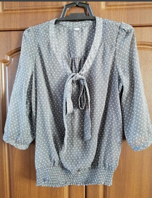 Блузка сірого кольору в білий горошок, з бантом спереді. Полупрозрачна. В ідеальному стані. Дивіться інші мої оголошення!