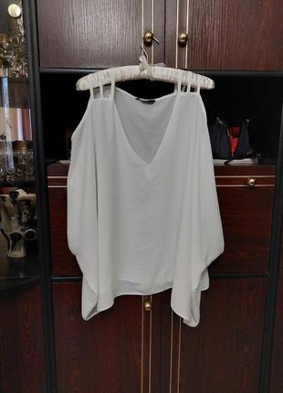 Білосніжна шифонова блузка, з відкритими плечима, з трикутним акуратним вирізом. Тканина не просвічується. За додатковими запитаннями звертайтеся в личку, завжди на зв'язку.