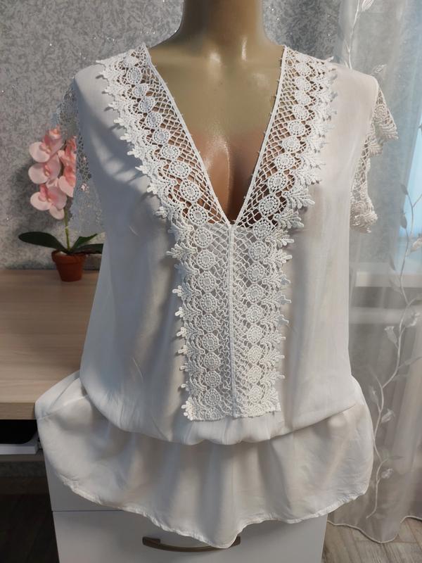 Жіноча біла блуза з мереживом, з 100% котону, розміром М,L. На бедрах на резинці. Трохи просвічується,стан нової речі без етикетки,ідеальний ,якість відмінна. Маде ін Італія.