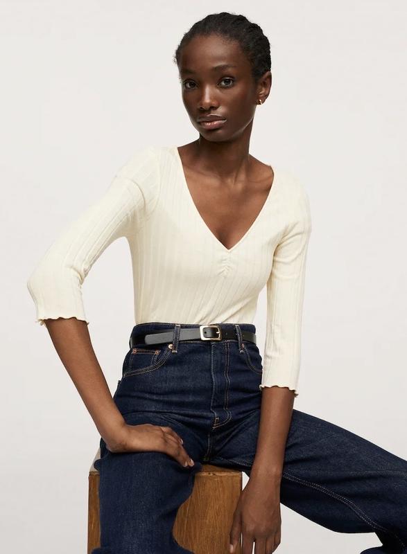 Тканина з бавовни. Тканина в рубчик. Еластична тканина. Базова модель. V-подібний виріз, рукав три чверті. Рюші на декольте. Стьобана обробка.