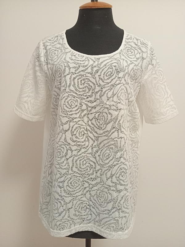 Дуже приємна до тіла легка блузка. Спинка гладка, спереду та рукави в трояндах. Розмір вказаний 36, підійде на 44-46-48, точніше за замірами, тканина трохи тягнеться, заплющує очі до замірів груди-талія-бедра по 2-3 см, заміри: довжина від плеча 64, по бок. шву 42 плечі 35 ПОГ 50 ПОТ 50 НОС 52 довжина рукава 25, по внутр.шву 10 НО краю рукава 15 висота пройми 24 глибина вирізу горловини спереду 12. Склад не вказаний, сірник 100% найтонший віскоза, перед тим один із різновидів поліестеру — тканини тонкі напівпрозорі — фото руки під тканиною наприкінці. Стан майже ідеальний, але є трохи ледве видимих дрібних ковтунців знизу виробу — можна побачити на останньому фото, коли рука під тканиною, має дуже гарний стан. Висилаю після повної оплати. Автоматичні замовлення приймаються. Також у мене в продажу є добрий вибір блузок/тунік/футболок/маек/кофточок різних розмірів за доступними цінами — заходьте поцікавитися й придбати.