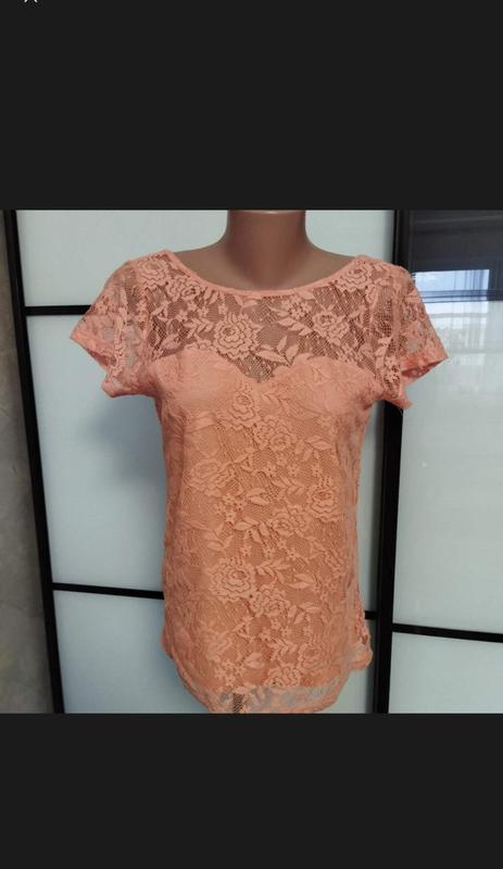 Є в двох кольорах Ніжна блузочка з коротким рукавом виконана з мережива. На трикотажній підкладки, яка спереду оформляє груди вирізом "сердечко", а ззаду - трохи подовженим V-подібним вирізом . Колір - персиковий і білий є в двох кольорах Розмір: 40. Склад: верх - 100% поліестер, підкладка - 100% бавовна, заміри: довжина - 62см рукав від плеча - 13см -пог - 45см - пот- 413см -поб - 49см Стан: відміннй, тягнеться відмінно.