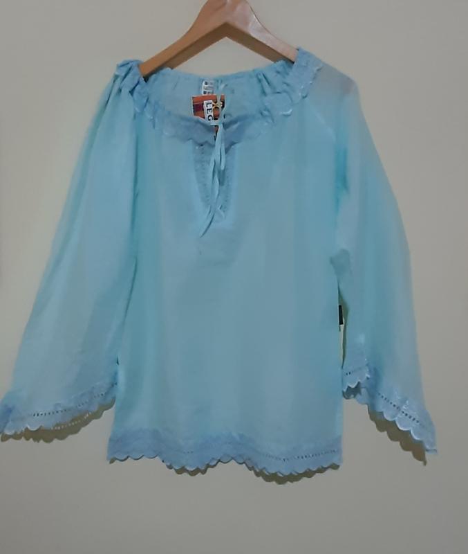 Туніка, блуза голубого кольору, літня, нова , з біркою, вир-во Індонезія, куплена в Італії. Рукав довгий, реглан. Горловина на стягуючих зав'язках (шнурочках), розмір горловини регулюється. Внизу є бокові розпорки. Блуза оброблена голубим кружевом. Тканина- 100% RAYON. Розмір L. Заміри: Побхват грудей 51см Побхват талії 50см Побхват по низу 52см Довжина рукава від горловини, яка регулюється приблизно 72см Довжина рукава від пройми 46см Ширина рукава вгорі 23см/20см внизу
