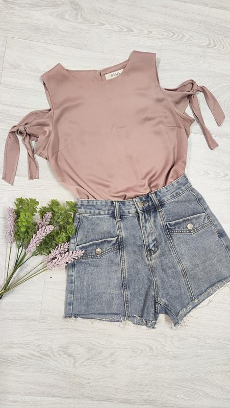 Легка літня блуза з відкритими плечима на зв'язках. Є незначні стяжки ,які візуально не видно .