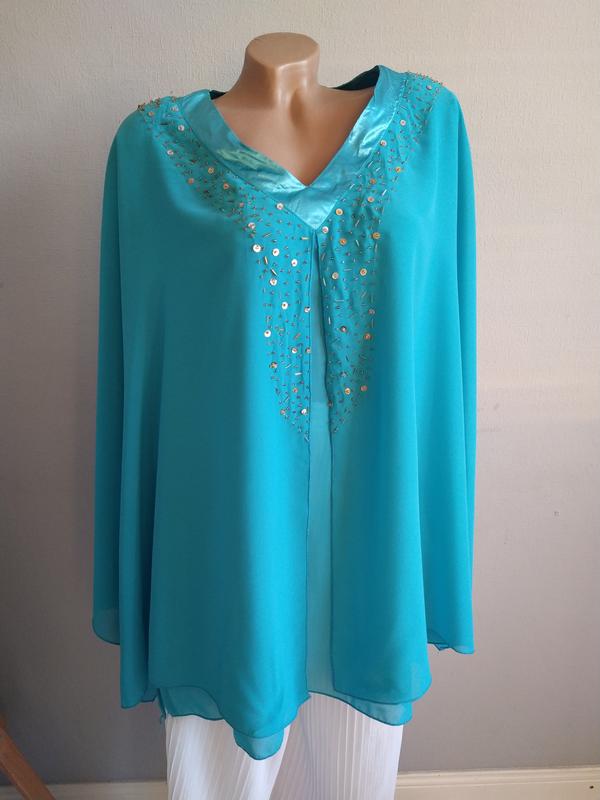 Безпечною оплатою Новою поштою не відправляю, можливо тільки Укрпоштою та Розеткою. Ошатна блуза 2 в 1, основа - майка прямого крою, зверху накидка, балахон з V-вирізом, розшитий бісером, дуже ефектно приховує руки, європейський розмір 58, виміри основи (майки) довжина - 72 см, ПОГ - 59 см, пройма - 30 см, ПО нижньому краю - 69 см. Підписуйтесь та дивіться інші мої товари, так Ви зможете знайти цікаві ексклюзивні речі. Буду щиро рада співпраці з Вами.🙂 ПОВЕРНЕННЯ та ОБМІНУ ТОВАРУ НЕМАЄ!
