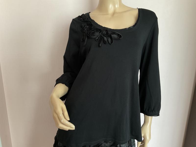 Відомий бренд. Трикотаж звичайний , тягнеться. Декор по горловині . Заміри в грудях 62-64см низ 62-64см довжина 64см рукав 45см в плечах 41-45см 25:6:23