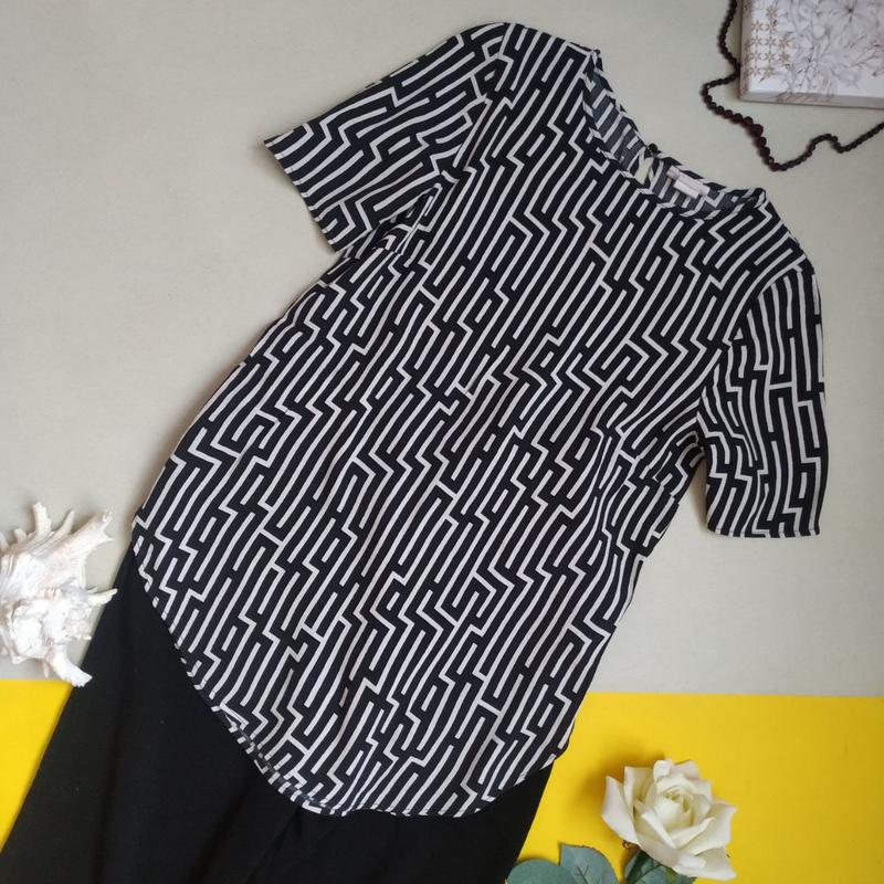 Продовжена блуза в геометричній принт,з боків розрізи, приємна до тіла тканина Розмір36 Довжина 68 см ПОГ 44см Плечі 36см Знизу по бедрах 48см Стан практично новий