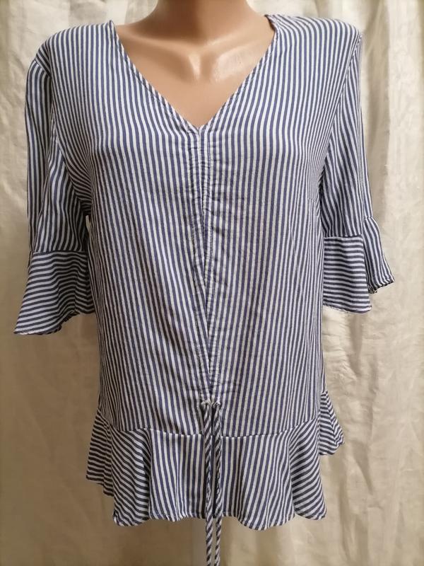 розпродаж 2 речі купуєте, отримуєте подарунок Всі речі в хорошому стані Гарна, тоненька блузочка, без защібок, рукав 3 /4 закінчується воланом, низ декорований баскою, перед можливо затягнути на смужечку , є недолік (фото) Тканина не тягнеться Плече 10 см Рукав 30 см Довжина 55 см СПИНКА 38 см НА півоб'єм грудей від пройми до пройми 42 см склад віскоза Купляєте те що на фото без претензій Перед покупкой все хорошо заміряйте, обміну та повернення немає Доставка НП та УП після оплати на картку. При доставці УП +10 грн за упаковку,до ціни товара.