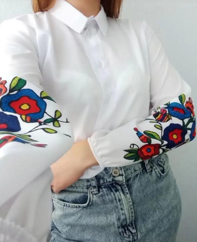 Блуза))) Розмір : 44-46, 48-50 Розмір: 52-54, 54-56, 56-58 Ціна 730 грн Тканина: сорочкова Малюнок: сублімаційний друк, стилізований під вишивку...