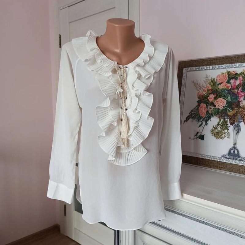 з натурального якісного шовку, волани з поліестру стан ідеальний, без зауважень розмір приблизно s довжина 66 рукав 65 пог 52 півобхват по низу 46