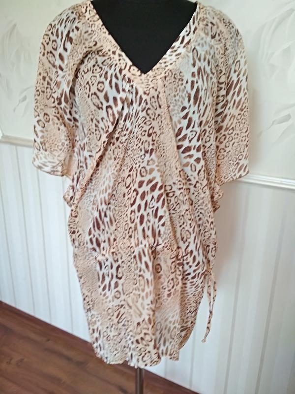 Ніжна шифонова туничка з красивими рукавами, у відмінному стані. Тканина трохи світиться, не тягнеться. По лінії заниженою талії є куліска і поясок, можна регулювати обсяг. ПОГ 64 см, ПОТ 60 см, ширина низу 65 см, довжина 91 див.