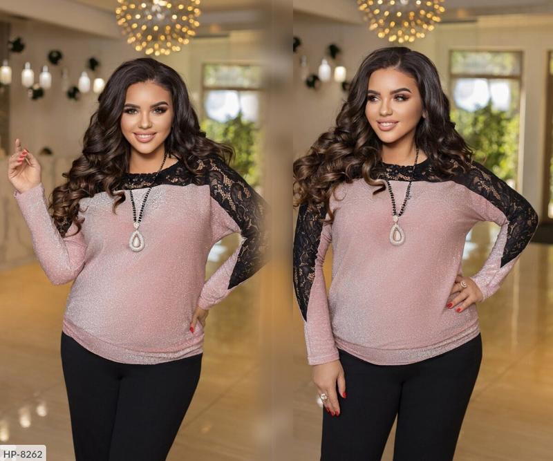 Блуза HP-8262 Размер: 48-50, 52-54, 56-58 Артикул производителя: 1114 Цiна: 650 грн. Цвет: розовый, серый, фуксия. Ткань: люрекс (не колется!), вставки из кружевного гипюра. Стильная блуза прямого силуэта декорирована отделкой из гипюра спереди и на рукавах. Измерения: 50-52. Блуза 75 см., рукав от плеча 65 см. ОГ 110 см. 54-56. Блуза 76 см., рукав от плеча 70 см. ОГ 118 см. 58-60. Блуза 78 см, рукав от плеча 75 ОГ 126 см. тим