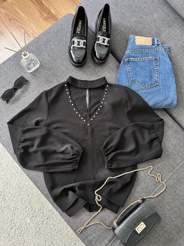 Трендова блузка papaya з бусінками та чокером Марка Papaya Стан - ідеал Розмір - M/L Довжина з переду - 59см Довжина ззаду - 66см Довжина плеча - 11см Довжина рукава - 60см Пів-обхват грудей - 52см
