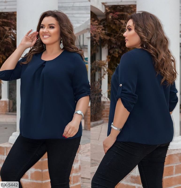 хл Блуза BX-5439 №1162 Розмiри: 50-52, 54-56 Колір: Білий, Рожевий, Електрик, синій. Тканина Маямі (не просвічується). Довжина виробу 70 см, рукав - 45 см.стильна блузка з оригінальною збіркою на грудях і хлястиком на рукаві. Перед з декоративними складками в області горловини. Горловина круглої форми. ♥️___________♥️___________♥️