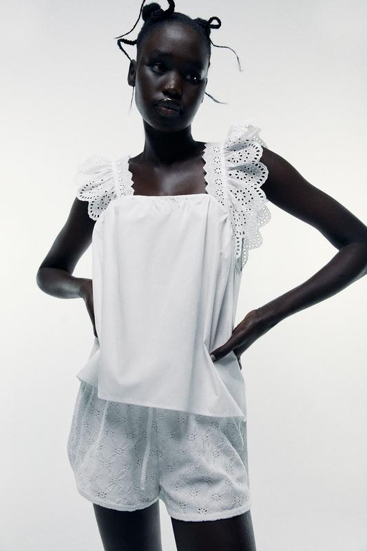 Білосніжна красива блуза з бавовни оздоблена на плечах ніжним мереживом. Вільний крой. Розмір XS ПОГ - 45-46 см Довжина - 56 см Cтан нової речі. Без етикетки.