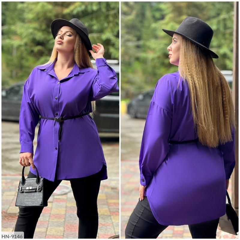 Блузка HN-9150 Цена: 675 грн. Размеры: 52-54, 56-58, 60-62, 64-66 Цена пояса 50 грн. Тканина: софт. Цвета: черный, серый, терракот, ярко-синий, фиолетовый, мокко, марсала, зеленый. Длина блузки: 84/91, 85/92, 86/93, 87/94 см. Длина рукава от горло.: 71, 72, 73, 74 см. Обхват рукава: 49, 51, 53, 55 см. Замеры готового изделия: 52-54 ОГ 124 ОТ 122 ОБ 122 56-58 ОГ 132 ОТ 130 ОБ 130 60-62 ОГ 140 ОТ 138 ОБ 138 64-66 ОГ 148 ОТ 145 ОБ 145 Стильная повседневная блуза из софта ( ткань растяжимости не имеет). Силуэт прямой, свободный. Воротник стояче-отложной. Застегивается на пуговицы по передней планке. Линия плеча спущена, рукав на манжете с пуговицей. Низ блузы выполнен асимметрично - спереди короче, а сзади немного дольше. Черный, плетеный пояс в комплект не входит, можно приобрести отдельно. Цена пояса 70 грн.
