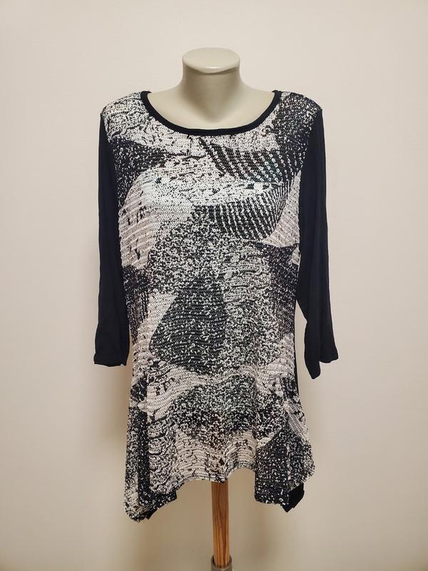 Трикотаж м'який, приємний на дотик, тянеться. ПОГ 58, ПОТ 57, ПОБ 70, плечі 47, рукав 48, довжина 77, до боків довше на 15 см.