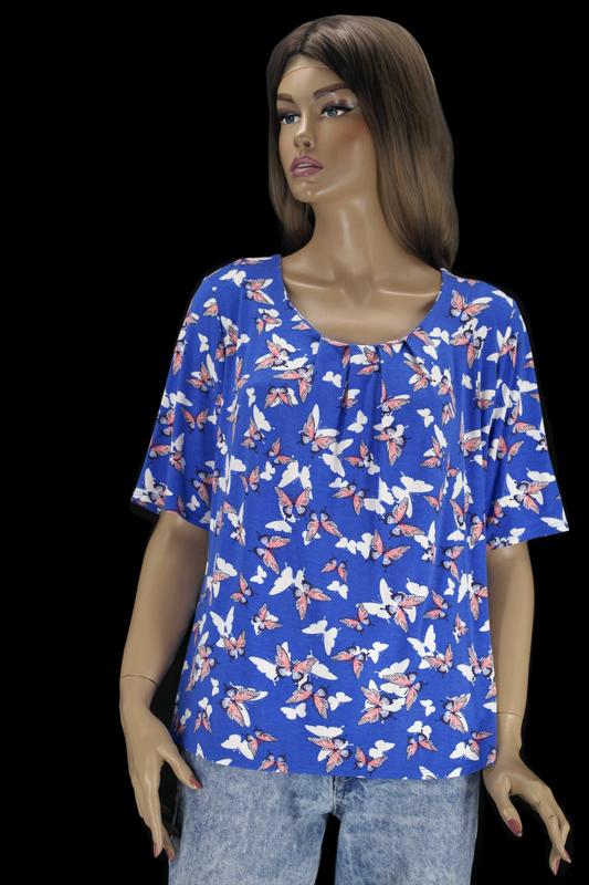 Красивая футболка "BHS" с бабочками, свободного кроя. размер uk22/eur50. Размер uk22/eur50. Замеры в нерастянутом виде (ткань тянется): -ПОГ - 60 см; -ширина по линии талии - 57 см; -ширина внизу - 64 см; -длина рукава - 30 см; -длина от плеча - 59 см. Без каких-либо дефектов. В отличном состоянии!