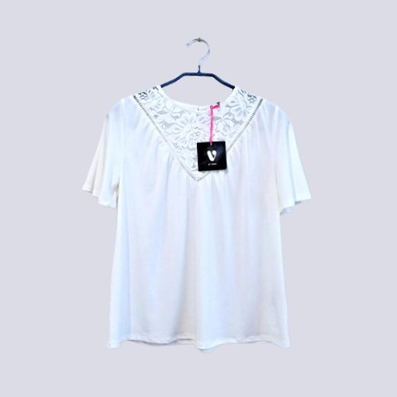 Блуза від англійського бренду V by Very. Декорована щільним мереживом. Тканина м'яка, тягнеться. (4107) Розмір: 10 Напівобхват грудей: 50 см Напівобхват талії: 52 см Напівобхват стегон: 56 см Ширина пройми: 22 см Ширина плечей: 38 см Довжина виробу: 60 см Склад: 95% поліестер, 5% еластан