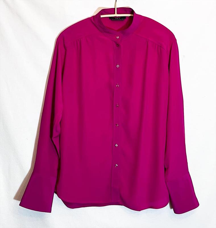 Яскрава, кольору малини з холодним відтінком фуксії блуза. Стан відмінний. Розмір не вказаний, найближче до М. Довжина-67,00 см Ширина плечей-44,00 см Довжина рукавів-57,00 см НОГ-51,00 см НОТ-47,00 см Склад: 29% шовк, 71% ацетат.