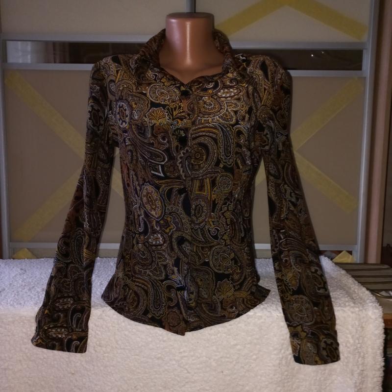 Дуже добрий стан. Є підплічники. Красиві гудзики. Об'єм грудей – 88 см; довжина – 57 см; довжина рукава – 56 см. Вибирайте подарунок до замовлення з безкоштовних товарів.