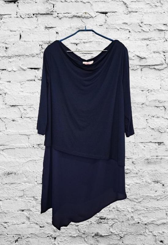 Туніка від німецького бренду Sheego. Основна частина із крепової тканини. Рукави та верхній шар із трикотажної тканини. Низ асиметричного крою. (7556) Розмір: 48/50 Напівобхват грудей: 63 см Напівобхват талії: 62 см Напівобхват стегон: 68 см Ширина пройми: 30 см Ширина плечей: 44 см Довжина рукава: 46 см Напівобхват горловини: 38 см Максимальна довжина виробу: 102 см Склад: основна частина 100% поліестер, верхній шар та рукави: 95% віскоза, 5% еластан