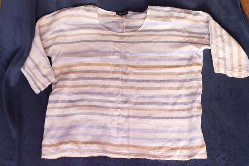 Новий Розмір – 46-48 (євро – М) ПОГ – 66 см Напівокружність по низу блузки – 68 см Довжина по спині – 65 см Довжина рукава від вирізу горловини – 53 см (три вчерті) Ширина рукава вгорі (половинка) – 19 см Ширина рукава внизу (половинка) – 15 см Склад: 39% коттон, 34% віскоза, 26% льон, 1% поліестер. Вільна блуза-розлітайка (на жарке літо саме те). Повністю з натуральної тканини (з поліестеру там тільки оздоба з люрексу).