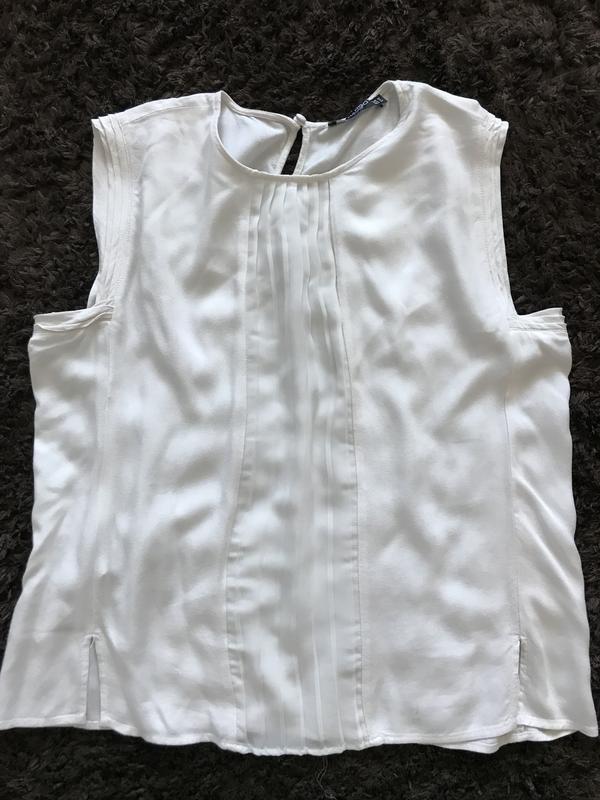 Довжина 58 див., ПОГ 50 див., вниз пряма, на передній планці вставка плісировки, гарно лягає, заміри без натягу, колір молочний.