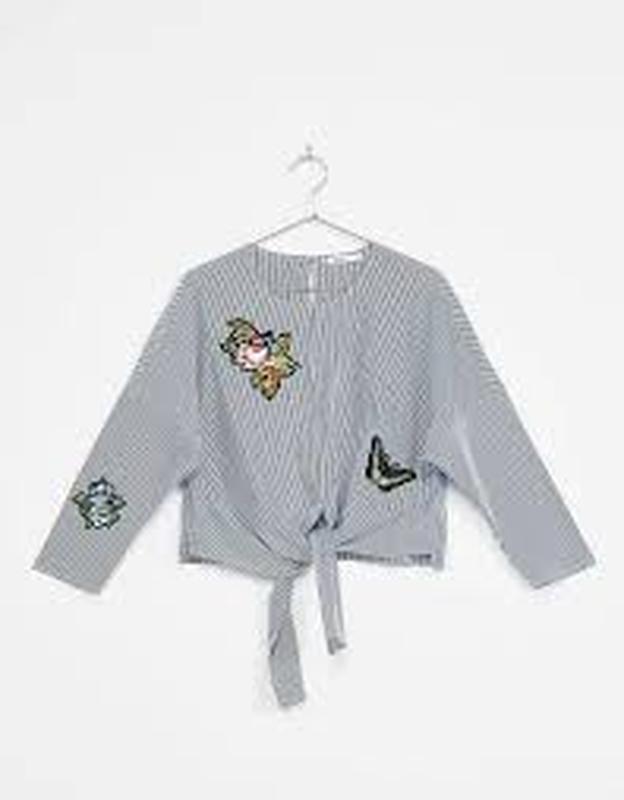 Стильна блузка,без дефектів. Бірка з складом відсутня. Тканина хлопок з кластаном Довжина від плеча 46 Рукав від шиї 57 Пог 53-59 Пот48-60 Довжина завʼязок 31
