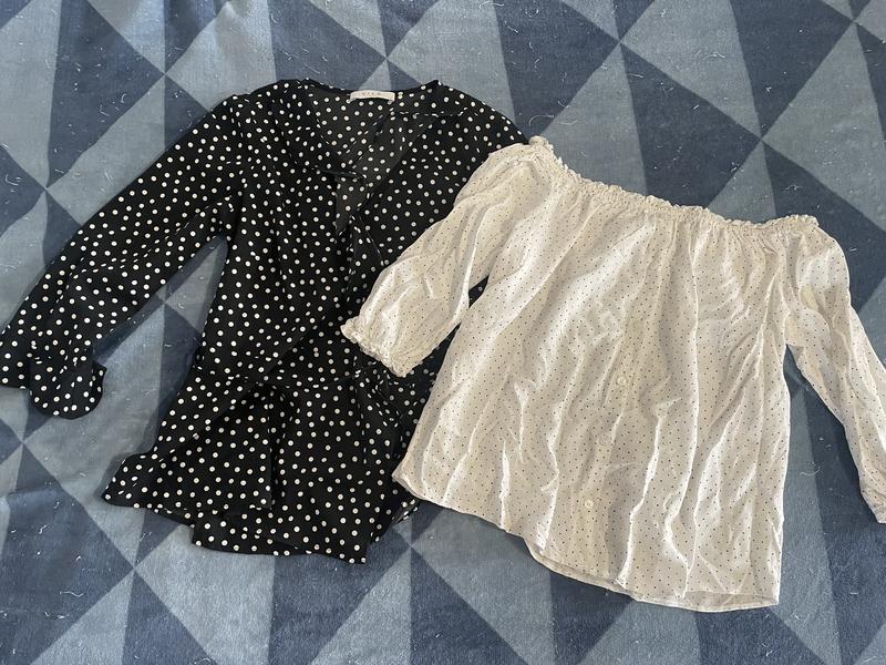 Чорна блузка на запАх, з оборками на рукавах і вирізі. Розмір ХС-С (на груди до 87 см) Біла блузка зверху на резинці, можна носити з відкритими плечима. Розмір С. Стан обох новий, тільки чорну вдягала 1-2 рази. Ціна за 1.