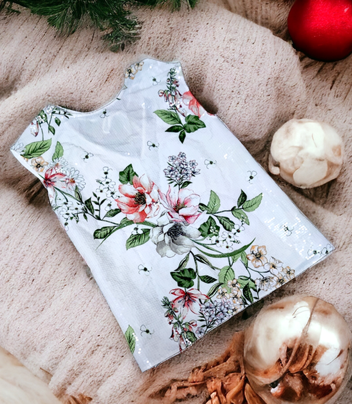 Розмір вказаний 14 НОГ 48-49 см Довжина від плеча 64 см Блуза прикрашена повністю в паєтки тільки спереду, ззаду просто тканина Склад поліестер віскоза й еластан Без підкладки, всередину не колеться