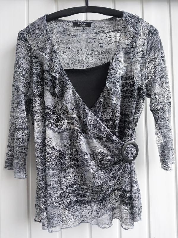 Вказано розмір: EUR 42 UK 14 Тягнеться. Заміри в спокійному стані: Напівобхват грудей (від пахви до пахви) чорного топу: 44 см Напівобхват талії чорного топу: 41 см Напівобхват по низу чорного топу: 46 см Довжина ззаду (від найвищої точки плеча) верхньої блузи: 59 см Довжина рукава (від плеча) верхньої блузи: 40 см