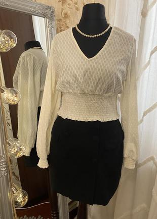 Блуза від бренду VERO MODA у молочному кольорі. На манжетах і по талії резинка, що створює гарний силует рукава і підкреслює талію На бірці розмір L, але може підійти на М Стан відмінний Напівобхват грудей - 50 см. Напівобхват талії - 36 см. Довжина - 45 см. Довжина рукава - 45 см.