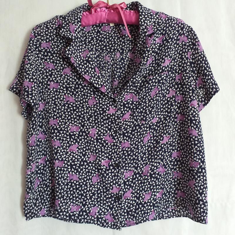 Идеальное состояние без нюансов . Бирка с составом срезана. В составе 100% шелковистая вискоза. Укороченный прямой крой. Длина 52,плечи 40,рукав 16,пог 50