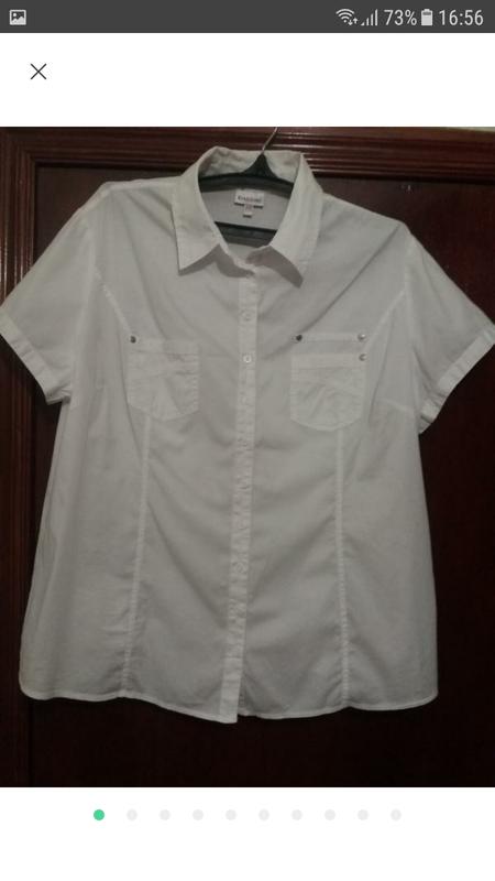 Белая х/б рубашка с коротким рукавчиком и карманчиками спереди.с рельефными вертикальными выточками спереди и сзади.Стан- прекрасный.Замеры: Пог 64см.Пот 60см.Поб 67см.Довжина рукава от горловины 32см.Довжина вещи по спине 67см.Ширина плеч 46см.Ширина спины 44см.Призентабельная белая рубашка без желтизны.состав ткани присутствует -е бирка.