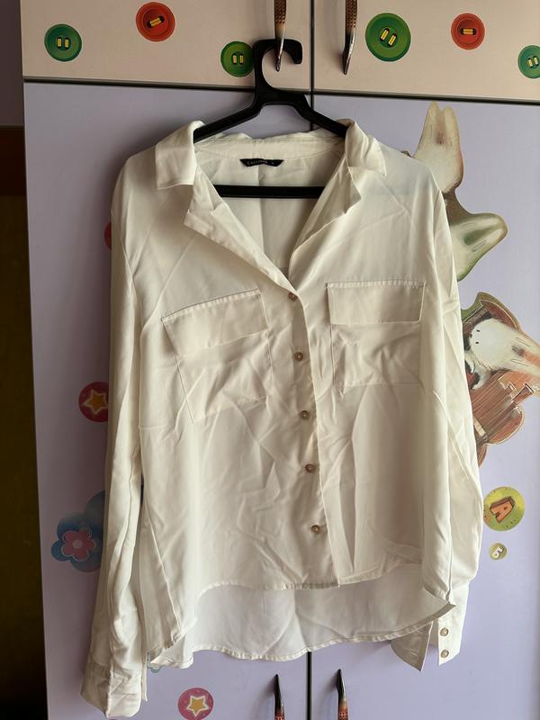 Блуза женская-девчачья. Цвет между белым и бежевым. В очень хорошем состоянии, но к сожалению мятая, потому что лежала долго без использования.
