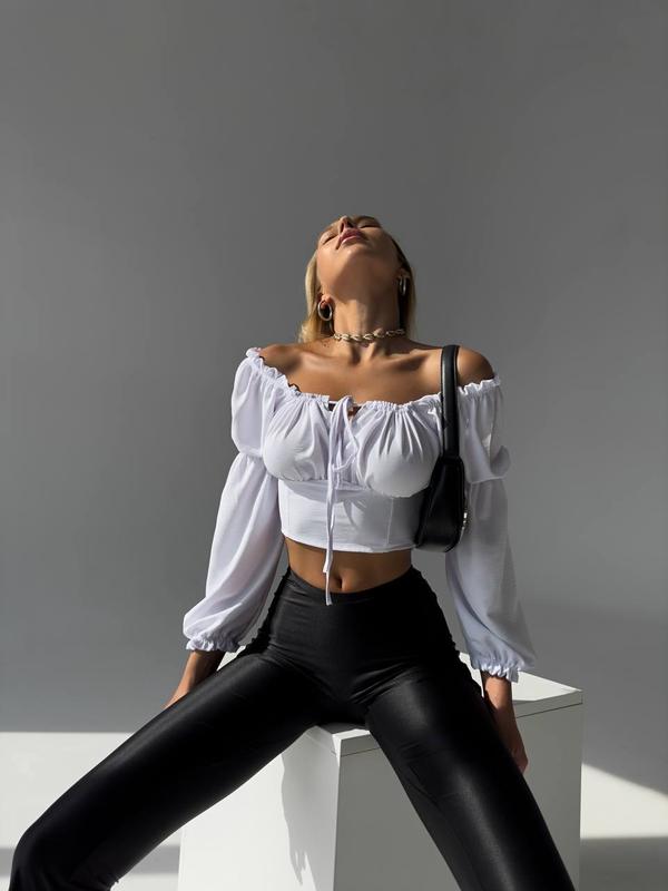 Блуза ▪️тканина : жатка ▪️колір: чорний, білий ▪️SM, ML Надзвичайно легка , повітряна та дуже стильна блуза на зав‘язках 😍 Декольте та посадку плечиків Можно регулювати зав‘язками 👌 На потаємній блискавці ; Фото реал ; Розмір: SM | ML Груди : 85-90 | 90-98 см Талія: 60-69 | 66-75 см