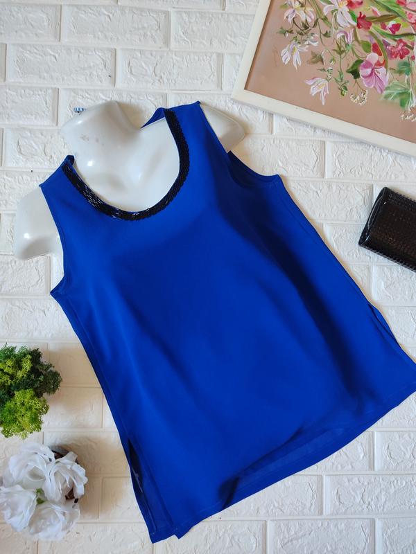 Блузка кольору електрик, оздоблення бісером, збоку розріз, тканина шифонова, спереду на підкладці Заміри на фото