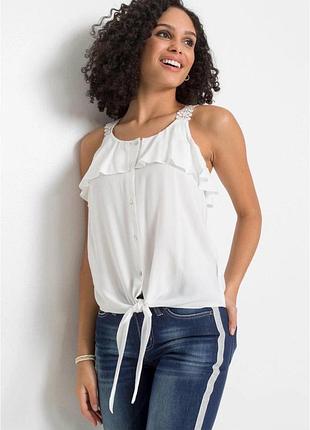 Склад: 100% віскоза Колір: молочний Розмір: S Літня кофточка, внизу завʼязується, з красивими ажурними бретелями