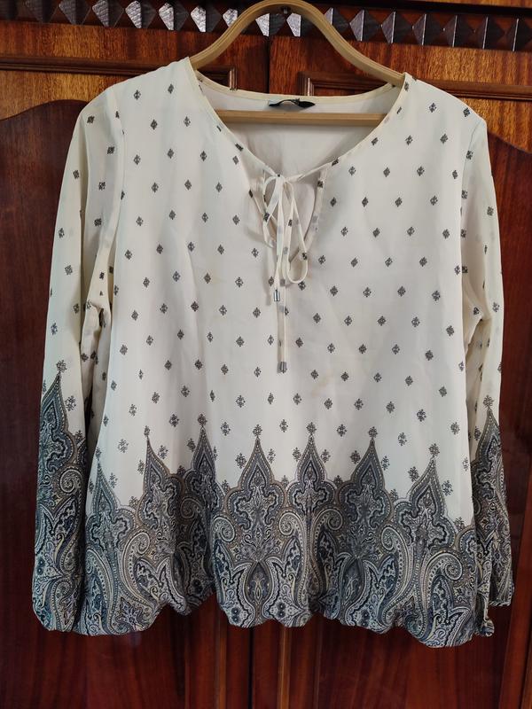 Гарна ошатна блуза з довгим рукавом, На підкладці. Тканина не тягнеться. Ширина по грудях 110см, внизу на резинці тягнеться до попереду до 60 см. Запитуйте, відповім на ваші питання