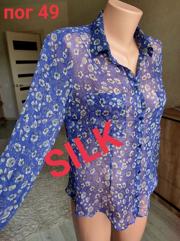 Тонесенька невагома прозора шовкова блуза. По бірці розмір EUR m, USA m, mex 28. По замірах пог 49см, довжина виробу 62см, рукав 62 см. Бірки зі складом тканини немає. В дуже хорошому стані 💥 з мінусів - немає одного гудзика на манжеті.