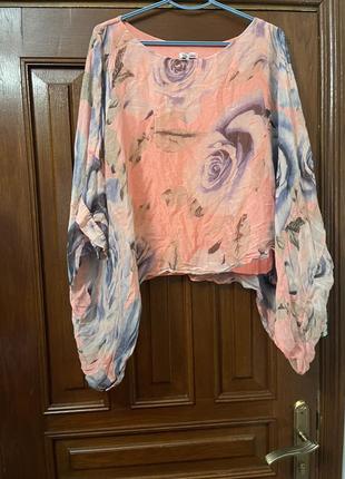 Блуза, Італія. Зовні шовк 50 %, віскоза 50 %. Підкладка віскоза/ поліестер. 55 см, тягнеться до 70 см, ширина низу 53 см, тягнеться до 75 см, довжина внутрішньої майки 60 см. Стан ідеальний, без дефектів.