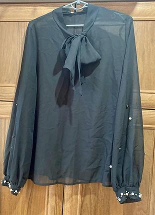 Предлагаю вытончину прозрачную блузу свободного кроя 42 р. Блуза черная и прозрачная, из качественного материала одевается под красивое нижнее белье, или под черную майку, с переда завязывается бант, рукава расшиты бусенками. Красиво смотрится и под юбку и под брюки. Эффектов нет, все бусы на рукавах присутствуют. Пишите в ПП по дистальными замерами. Отправлю безопасной оплатой