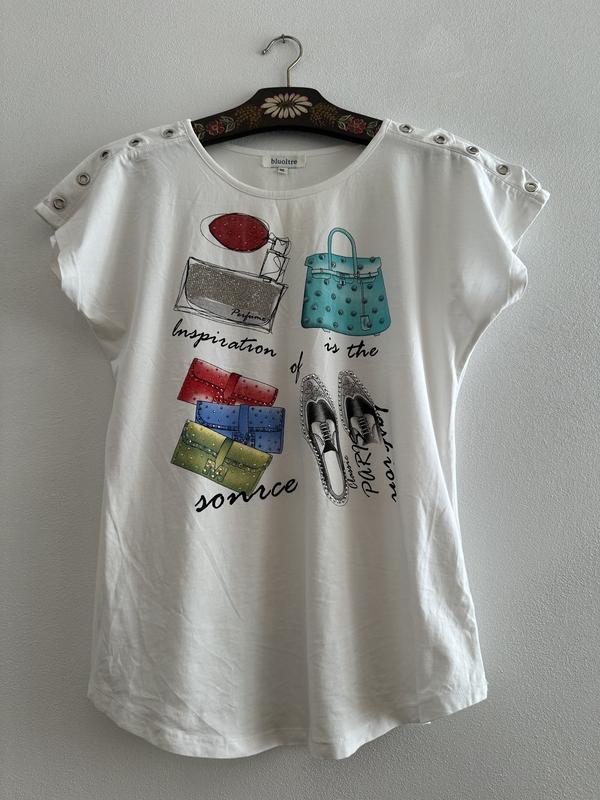 Блузка -футболка з принтом. Без дефектів. Бірка зрізана з складом. Тканина хлопок з еластаном(тягнеться) Довжина від плеча 68 Рукав від ворота 21 Пог за рахунок реглану 50-63 Пот 48-58 По низу 54-67