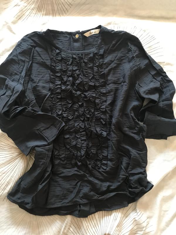 Жіноча блуза чорного кольору розмір Л,але потрібно дивитися по замірах, в ідеальному стані,жодного разу не одягали,матеріал дуже цікавий ,склад :87% Viskose,13 % Polyamid, на спинці є 7 гудзиків(на фото видно)спереду блуза оздоблена рюшами з того самого матеріалу що і блуза,рукав 3/4 прямий.Додаткові заміри надам.Якщо брати ще одну річ зроблю знижку