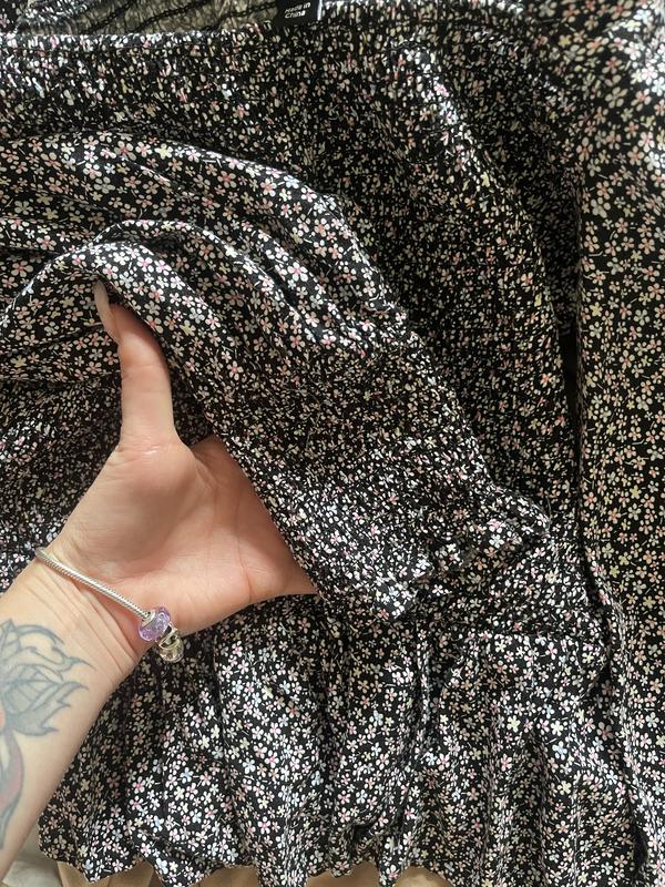 Блуза с рюшами внизу ,дуже гарно сідає під штани скіні і тд,гарний принт рукава балонами,Розмір 42 на М буде дуже гарно на с може бути трохи завелике